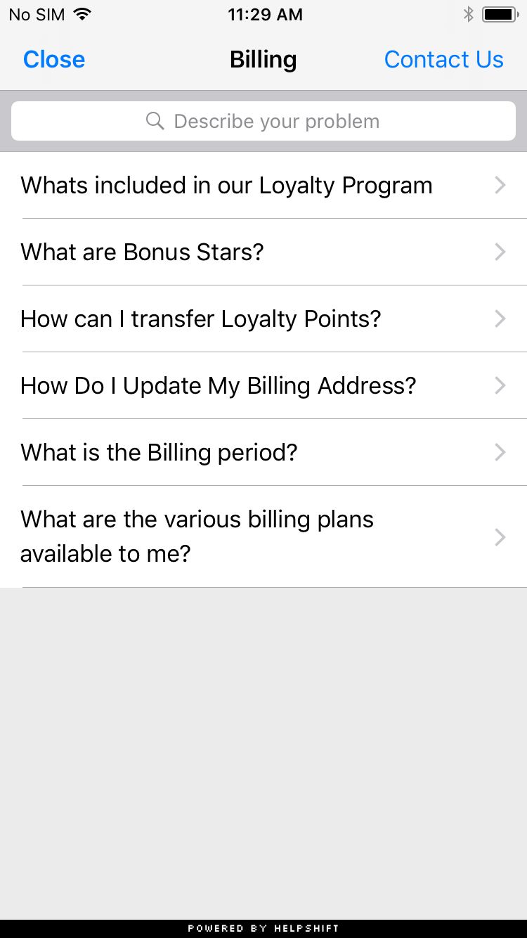 You can use the showFAQs api call to provide a way for the user to invoke the purpose built help/support section in your app. This is the easiest approach to enable help in your app as it bundles all the capabilities of the Helpshift SDK in a simple and intuitive interface. You can wire this api call to a "Help" or "Support" action in your app. This Activity combines the FAQ, Search and Contact Us functionality together in a single interface. In this view a user has to search for a specific question in the FAQ failing which they can report an issue. When you respond back to their question from the Helpshift Agent Dashboard, the reply will be shown as a count besides Contact Us, clicking on which will open up the conversation.